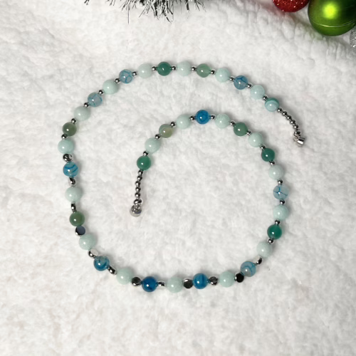 These Angelite and Agate Necklaces are composed of 8mm Natural Green Angelite Gemstone, 8mm Natural Blue Dragon Agate, silver-plated round spacer beads and magnetic clasps.
