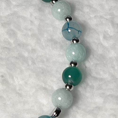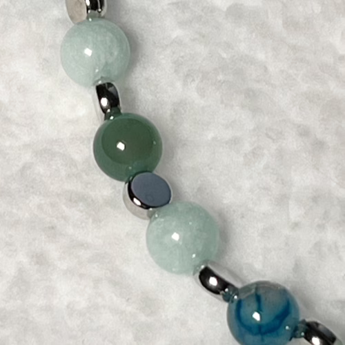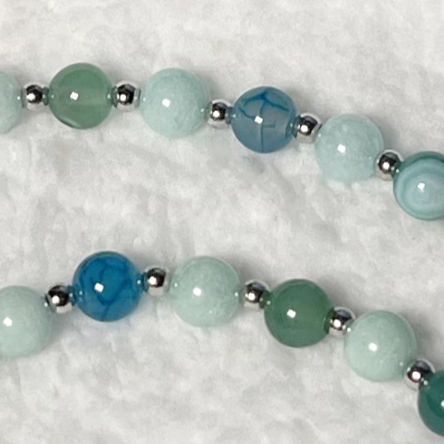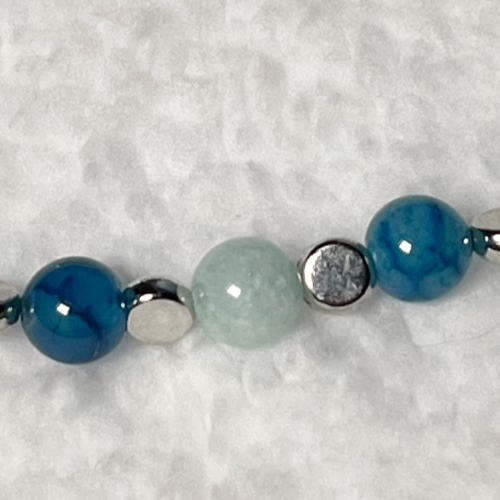 | Materials | Natural Green Angelite Gemstone, Natural Blue Dragon Agate, silver-plated round spacer beads and magnetic clasps |