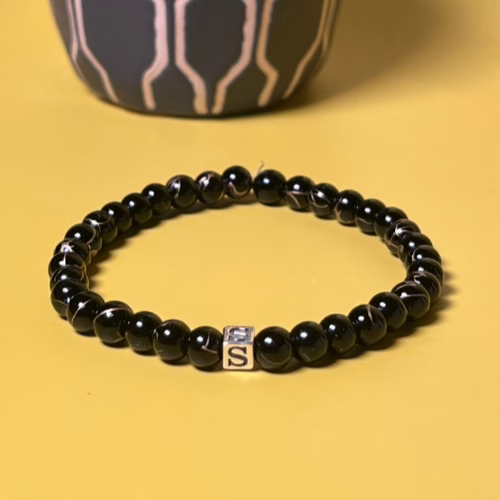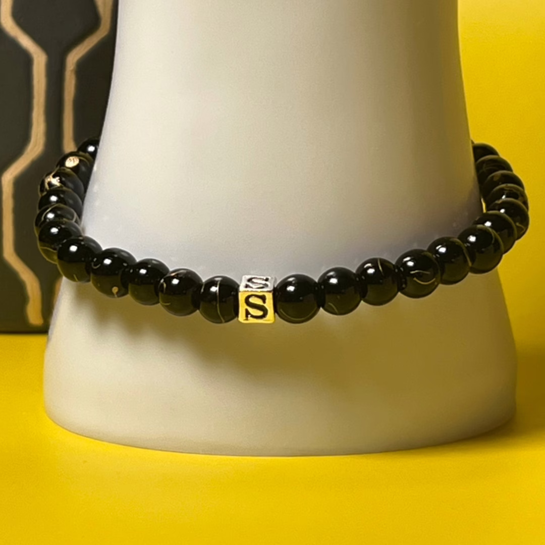 This Black Agate Initial Bracelet is composed of 6mm Black Golden Wire Agate Stone Beads, a 4.5mm Sterling Silver Initial cube bead and elastic bracelet cord