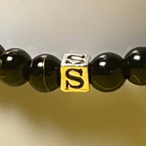 | Materials | Black Golden Wire Agate Stone Beads, 4.5mm Sterling Silver āSā Initial cube bead, elastic bracelet cord |