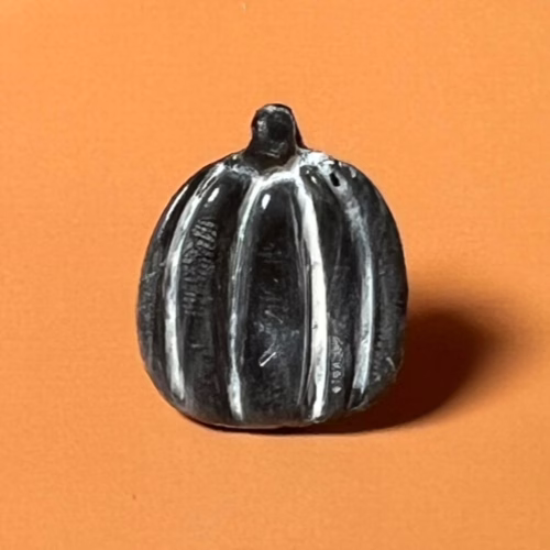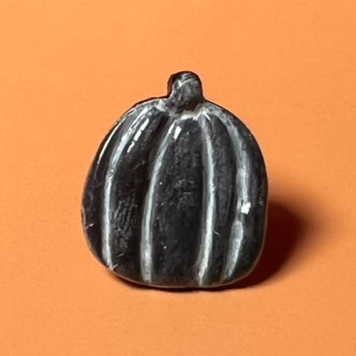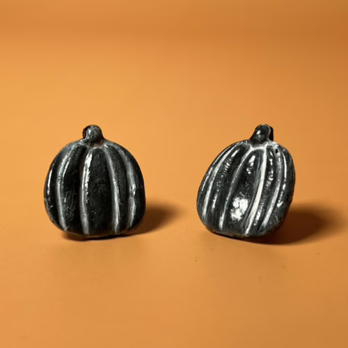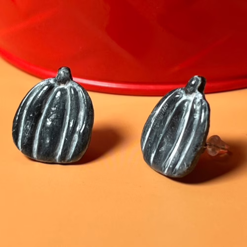 These Black Pumpkin Earrings are composed of black polymer clay, rubbed white highlights and silver plated ear posts