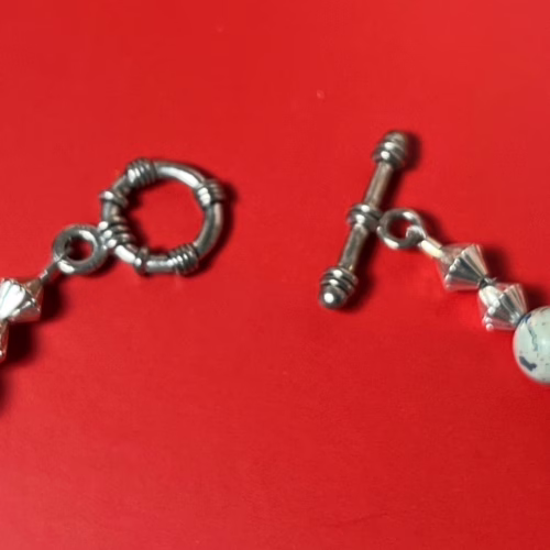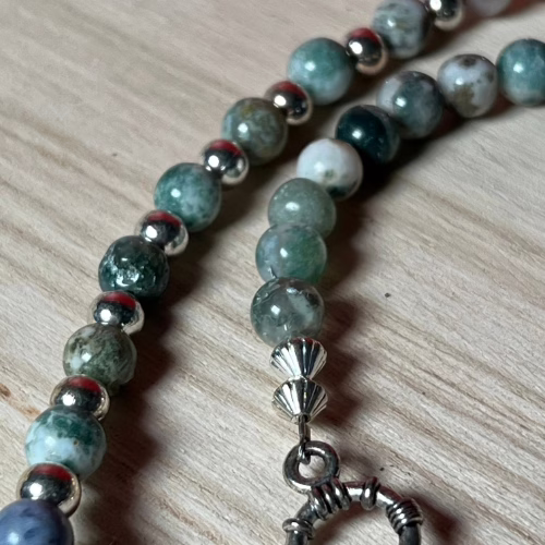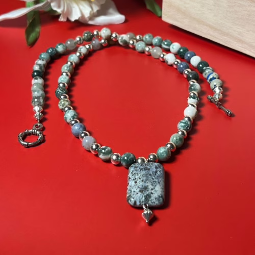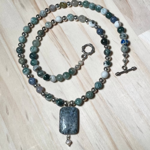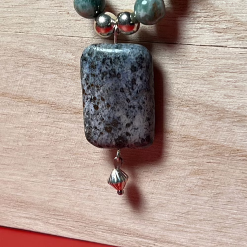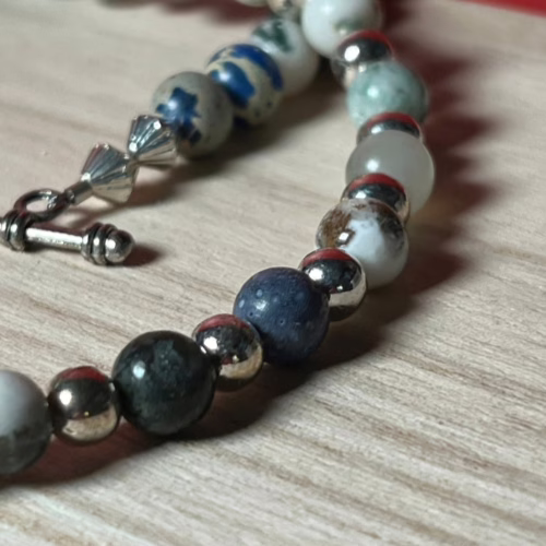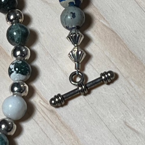 | Materials | 8mm Natural Stone Blue Imperial Jasper Beads, 6mm silver plated spacer beads and necklace components. |