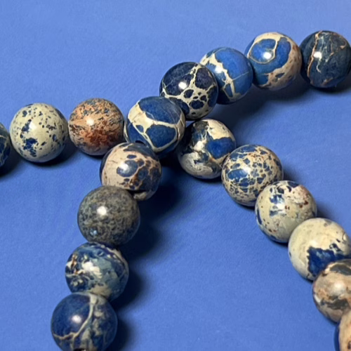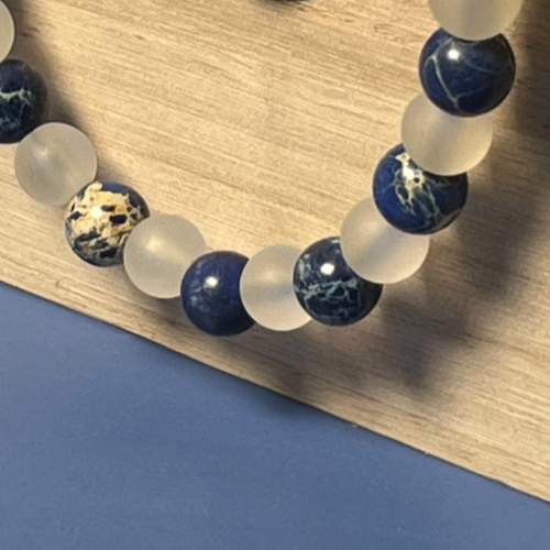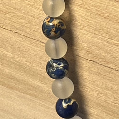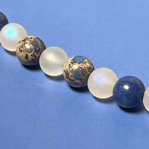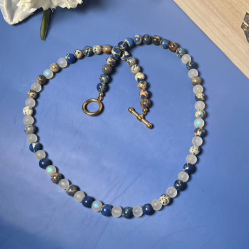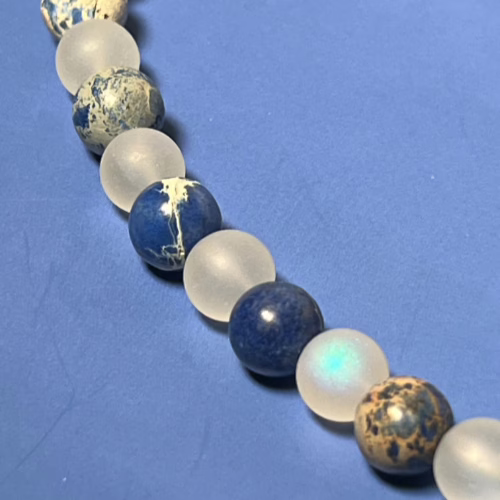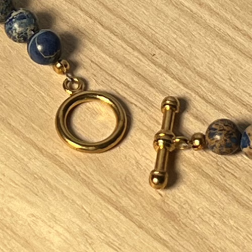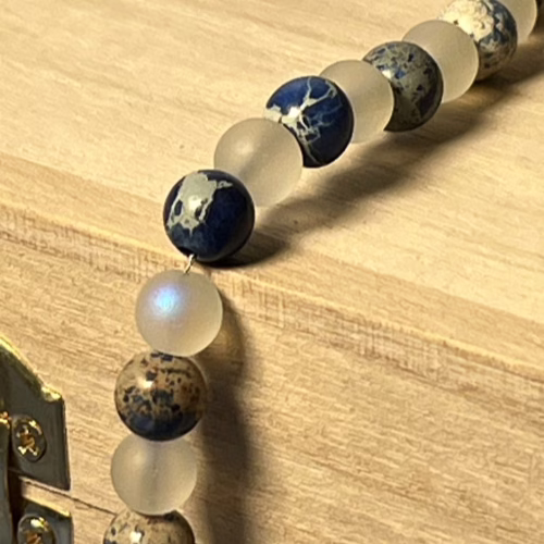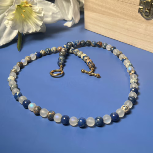| Materials | 8mm Blue Sodalite Stone Beads, 8mm Frosted Glitter Glass Beads and gold plated necklace components including a toggle clasp |