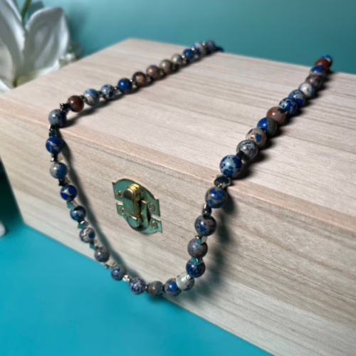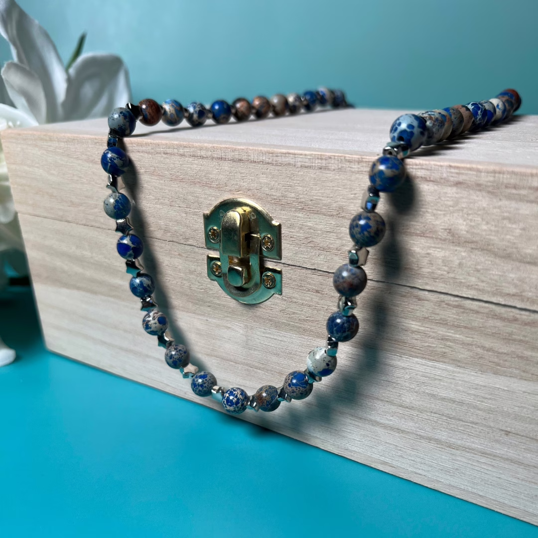 Ready to take your accessory game to cosmic heights? Introducing our stunning Blue Stone and Stars Necklace! Made with 8mm Natural Stone Blue Polished Round Beads, this beauty isn’t just a necklace; it’s a statement. Whether you’re dressing up for a night out or adding a splash of elegance to your everyday look, this necklace is your new best friend!