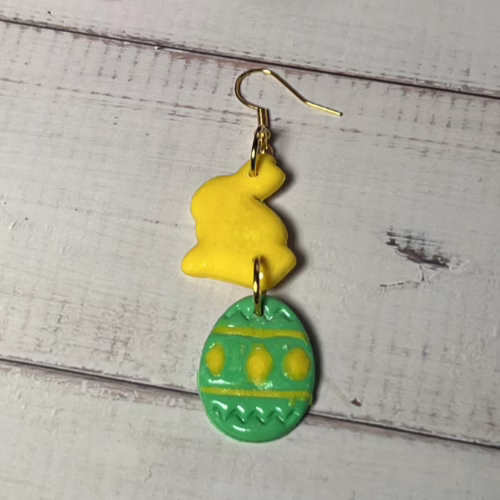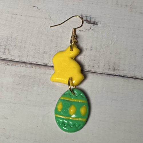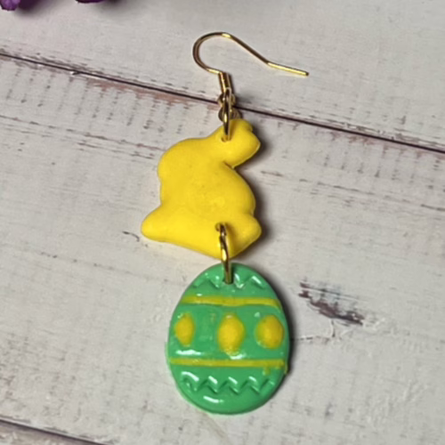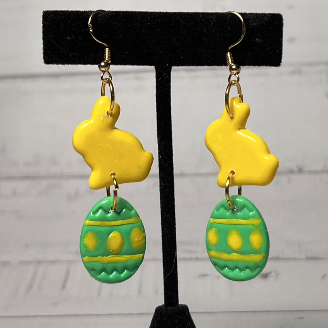 These Bunnies and Eggs Earrings are composed of polymer clay and gold-plated earring components