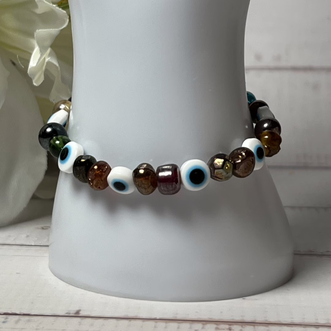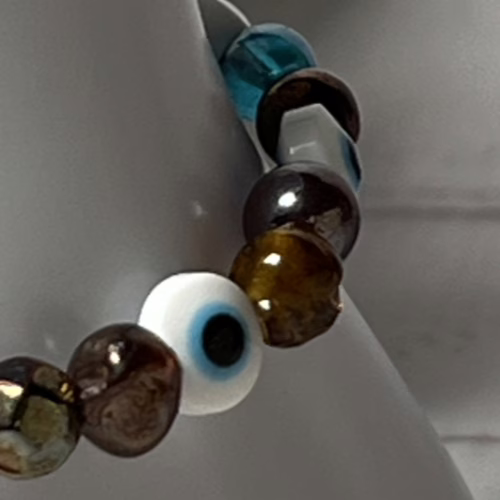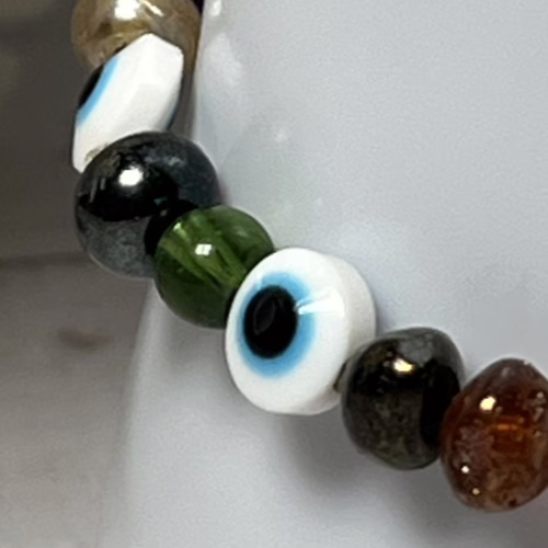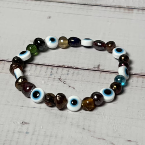 | Materials | White Turkish Handmade Evil Eye Beads – assorted 6mm spacer beads – elastic cord |