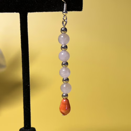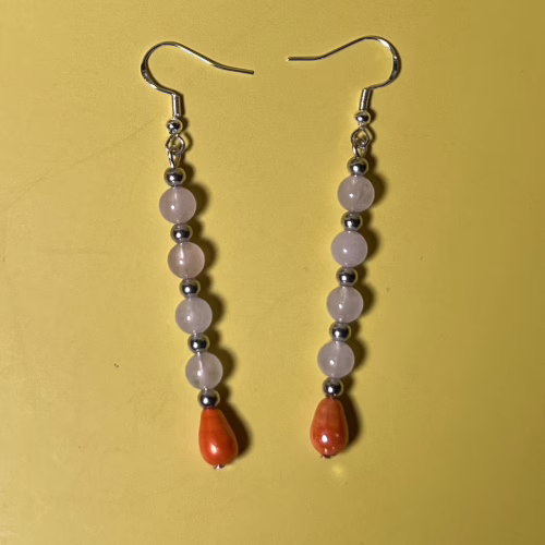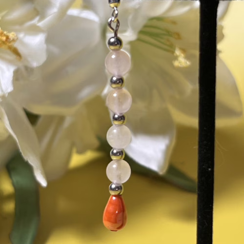 These Drops of Tears Earrings are composed of 6mm Natural Rose Quartz Gemstones, Red Tear Drop Beads, and silver-plated spacer beads and earring components