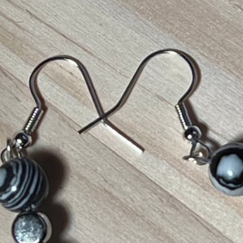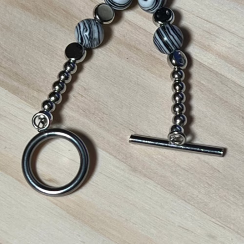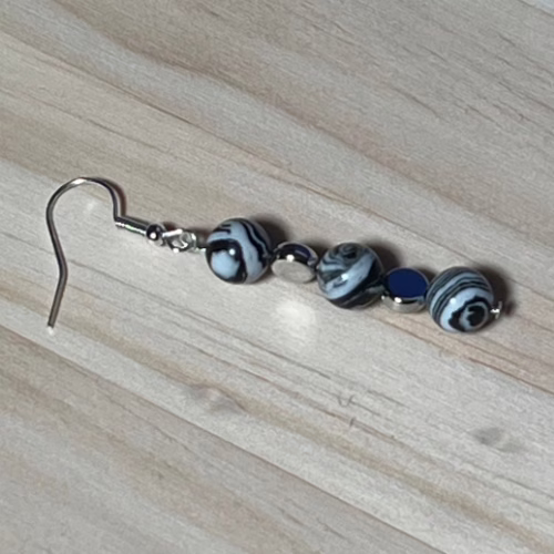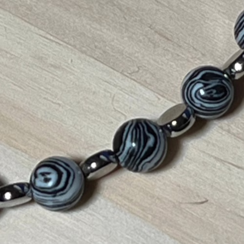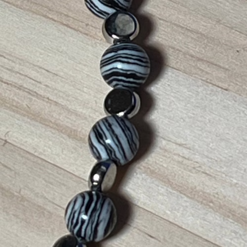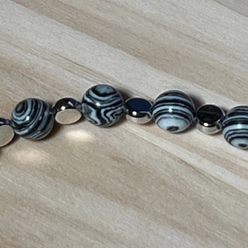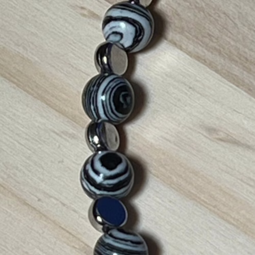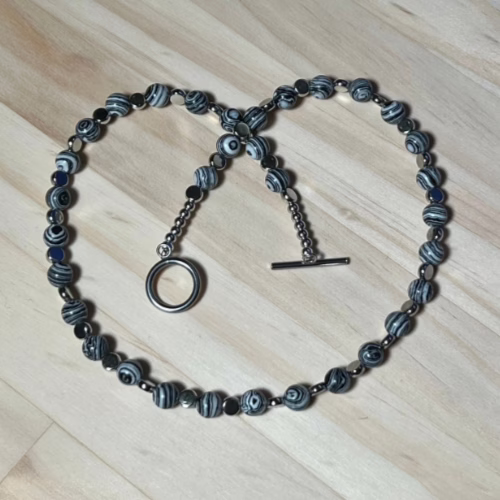 | Materials | 8mm Natural Black & White Malachite Beads, silver plated disc spacer beads, silver plated necklace and earring components including a stainless steel toggle clasp. |