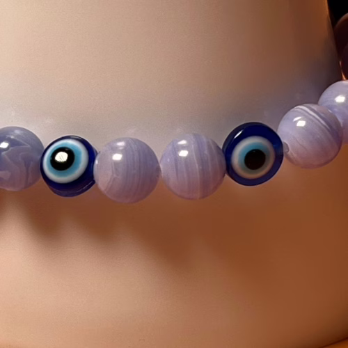 | Materials | Purple Turkish Handmade Evil Eye Beads – purple lace agate beads – elastic cord |
