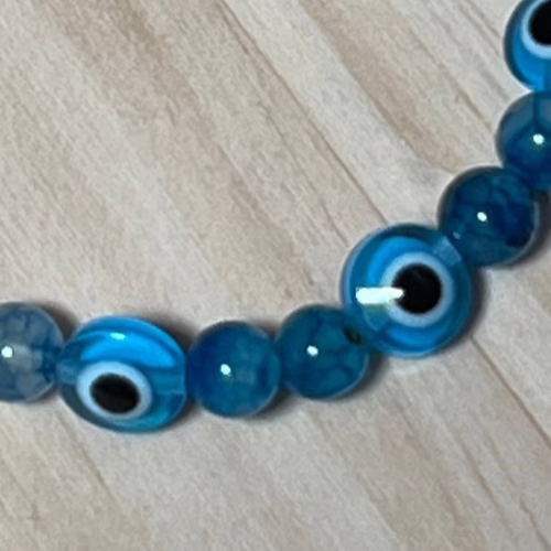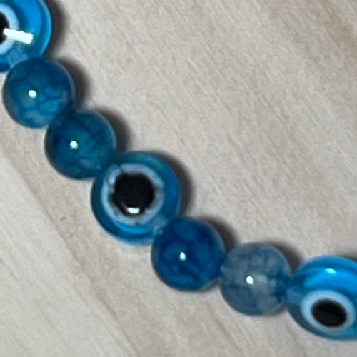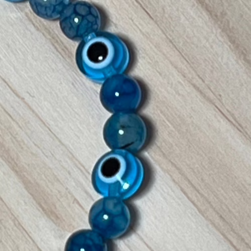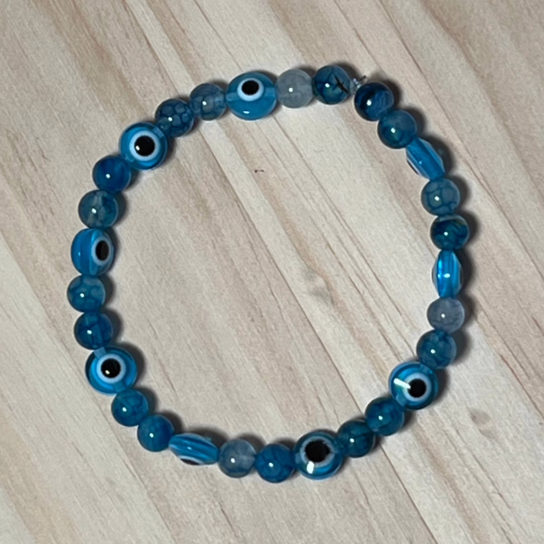 | Materials | Light Blue Turkish Handmade Evil Eye Beads – natural aquamarine beads – elastic cord |