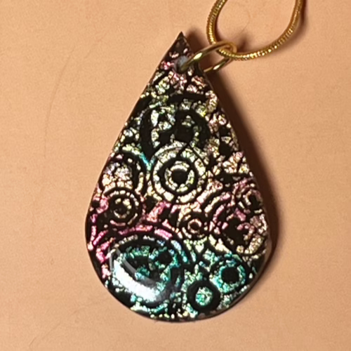 This Faux Dichroic Teardrop Pendant Necklace is composed of Polymer Clay base texturized with a JudiKins Clay Squisher and treated with gold leaf and Alcohol Inks. Protected with 2-part resin, Gold-plated 18” chain, split ring and lobster claw clasp.