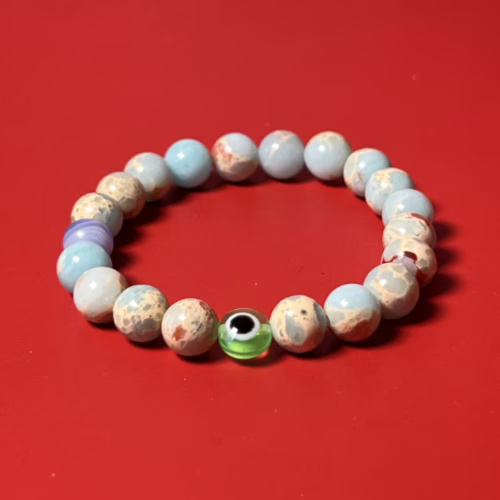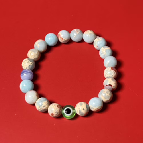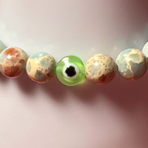| Materials | Light Green Turkish Handmade Evil Eye Beads, ocean blue jasper beads, elastic cord |