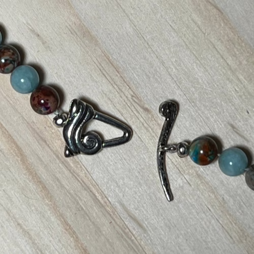 This Hematite And Jasper Necklace is composed of Natural Rainbow Hematite Beads, Red Blue Sea Sediment Jasper Beads, Colorful Sea Sediment Jasper Beads, Flat Oval Shaped Tiger Eye Beads and silver plated components including a toggle clasp.