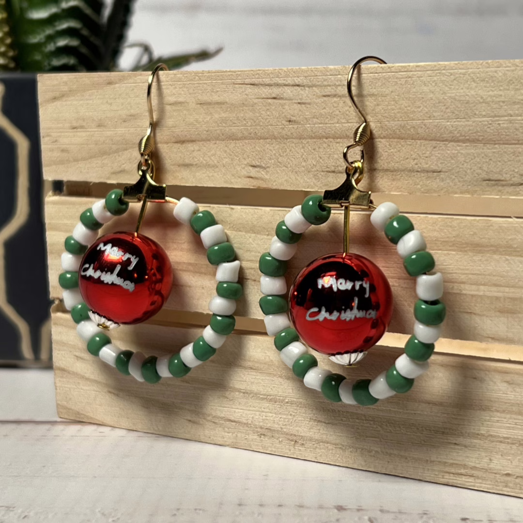 These Merry Christmas Ornament Earrings are composed of 16mm Merry Christmas Acrylic Beads, green and white seed beads and gold-plated earring components