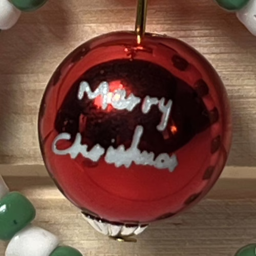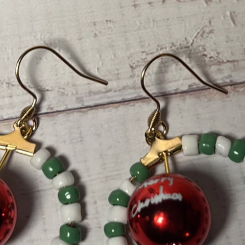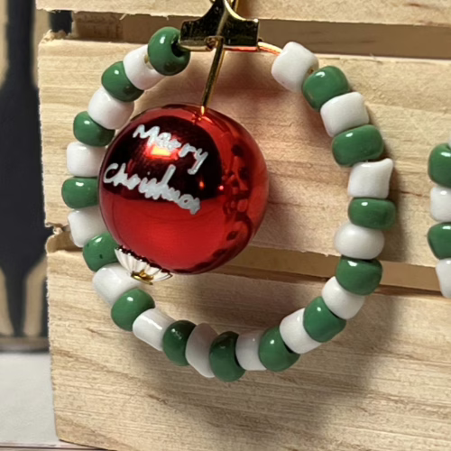 | Materials | Merry Christmas Acrylic Beads, green and white seed beads, gold-plated earring components |
