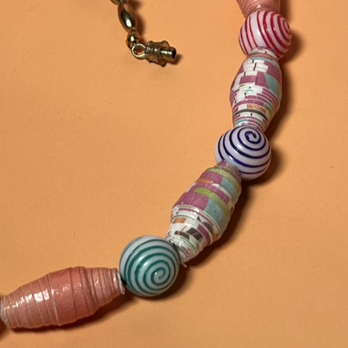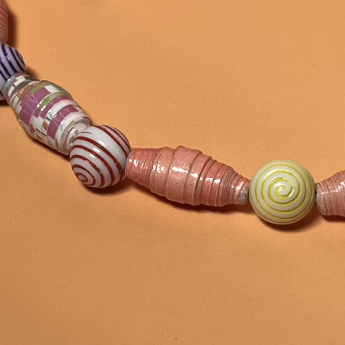 | Materials | Rolled Paper, Swirled Wood Round and Brass Beads and Barrel Clasp |