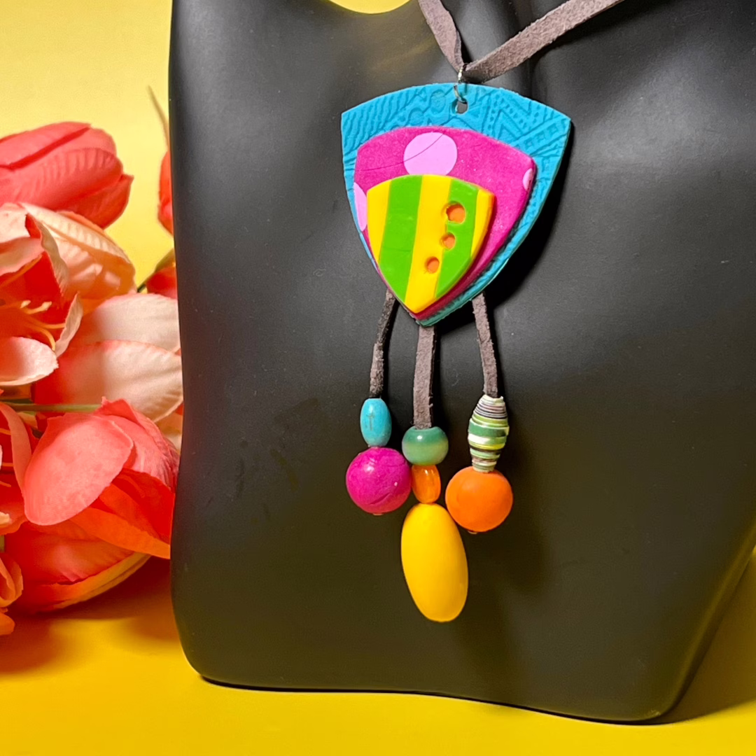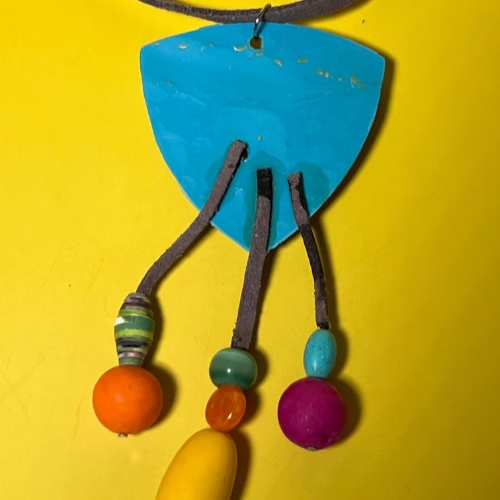 But that’s not all! Adorning this striking pendant are a series of rolled clay and paper beads, meticulously strung together with a soft leather cord. This combination not only adds texture and depth but also serves as a reminder of the beauty found in the imperfect and the handmade. Every bead is a testament to the artistry that surrounds us, encouraging you to embrace your own unique journey and the creative spirit within you.