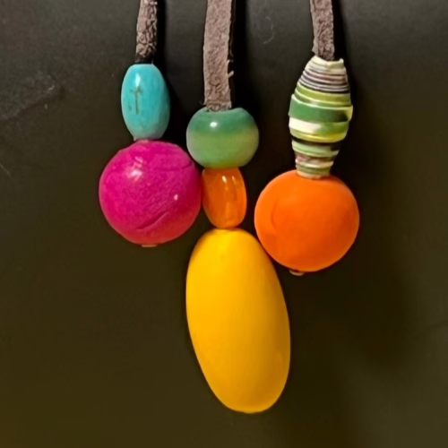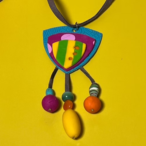 | Materials | Polymer clay, rolled paper beads, leather cord |