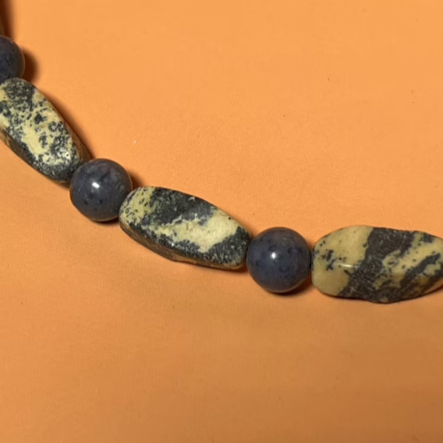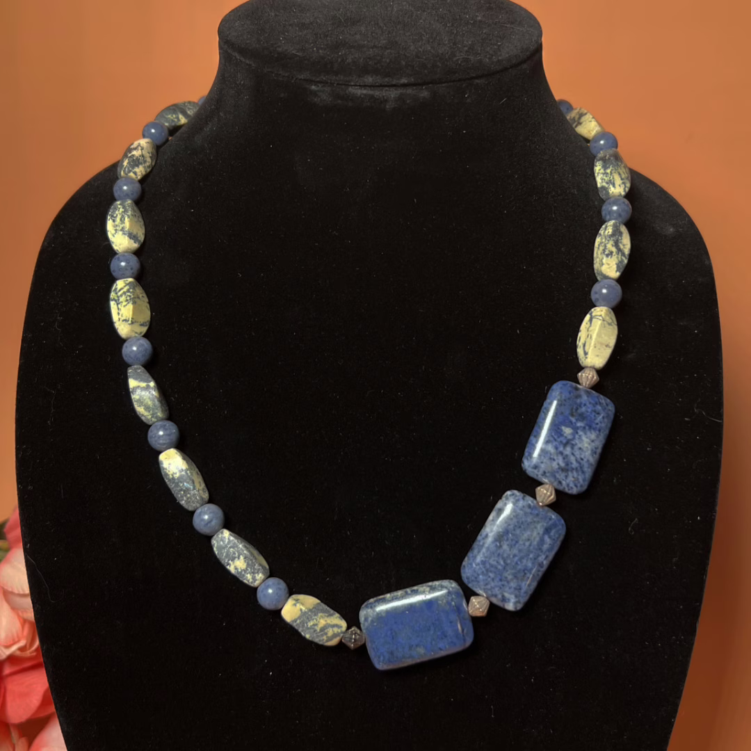 This Offset Blue Stone Necklace consists of Large Rectangular Focal Beads with a Mix of Round and Barrel Beads, Silver-plated spacer beads and an Antique Silver-plated Toggle Clasp.