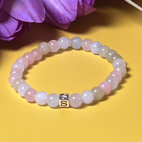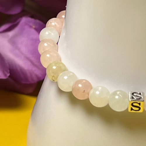 | Materials | Powder Morganite Beads, Sterling Silver āSā Initial cube bead, elastic bracelet cord |