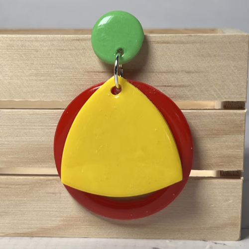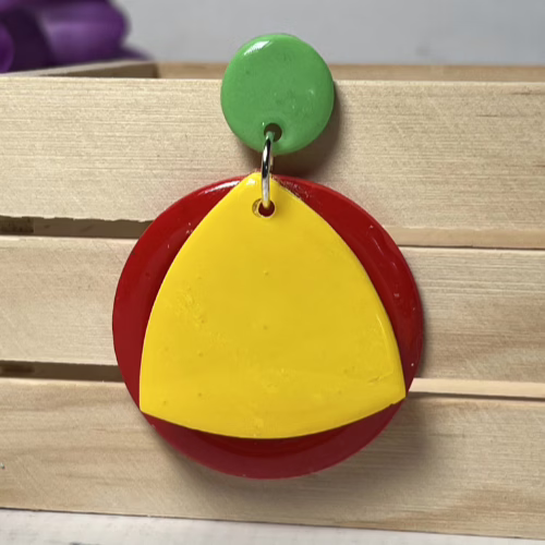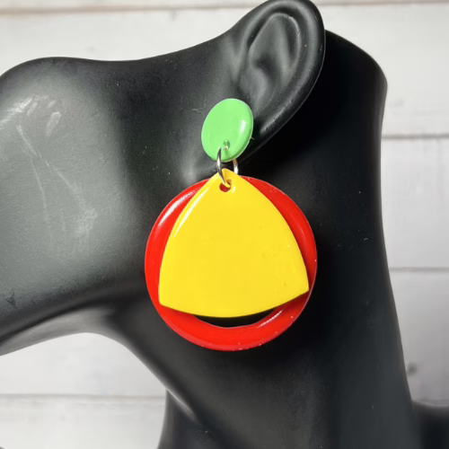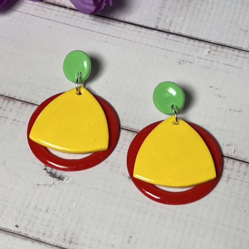 These Prue’s Geometric Statement Earrings are composed of Polymer Clay and silver-plated earring components including ear studs