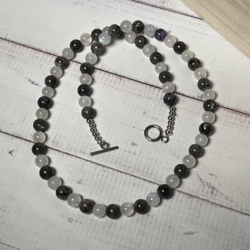 | Materials | Natural Purple Fire Dragon Vein Beads, Natural White Moonstone Beads, silver-plated necklace components |