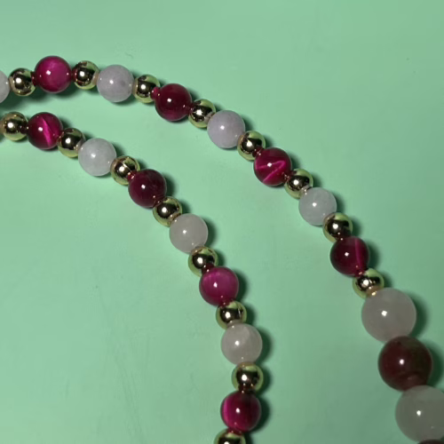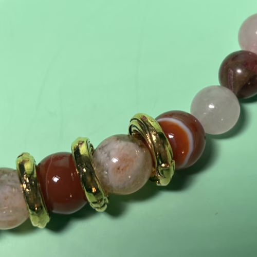 | Materials | 10mm Orange Moonlight Gemstone, 10mm Natural Citrine Stone, 8mm Natural Rose Quartz Gemstone, 8mm Natural Red Cloisonné Stone and 6mm Optimized Morganite Beads with Antique Golden Retro Style Spacer Beads and a gold-plated Toggle Clasp |