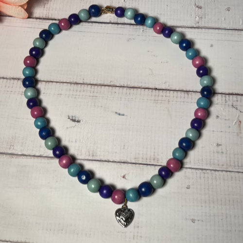 These Spring Hues Heart Necklaces are composed of 10mm Wood Beads, a silver-plated heart pendant and necklace components