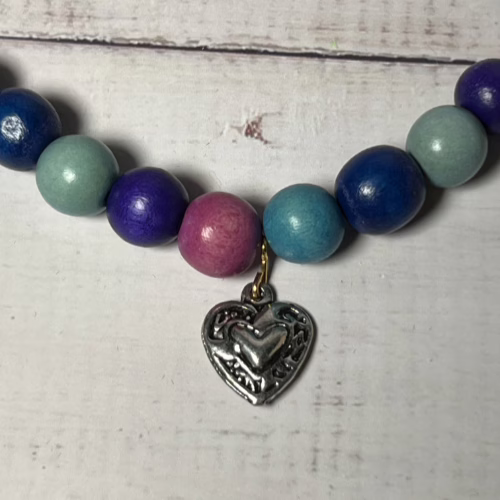 | Materials | wood beads, silver-plated heart pendant, magnetic clip |