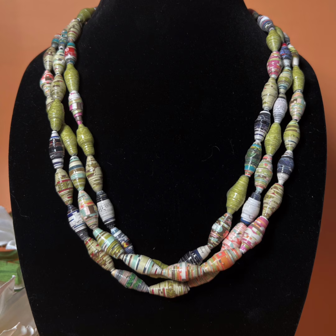 This Spring Rolled Paper Bead Necklace consists of 3 Strands of Rolled Paper Beads, Antique Gold-plated Necklace Components including Toggle Clasp