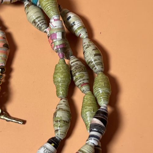 But wait, there’s more! Our Spring Rolled Paper Bead Necklace isn’t just a feast for the eyes; it’s also eco-friendly! Each bead is lovingly crafted from recycled paper, making it the ultimate guilt-free fashion statement. You can strut your stuff while saving the planet – talk about a win-win! Plus, the antique gold-plated components add a touch of elegance that says, “I’m here to party, but I also appreciate the finer things in life.”