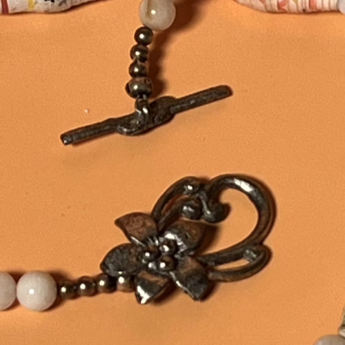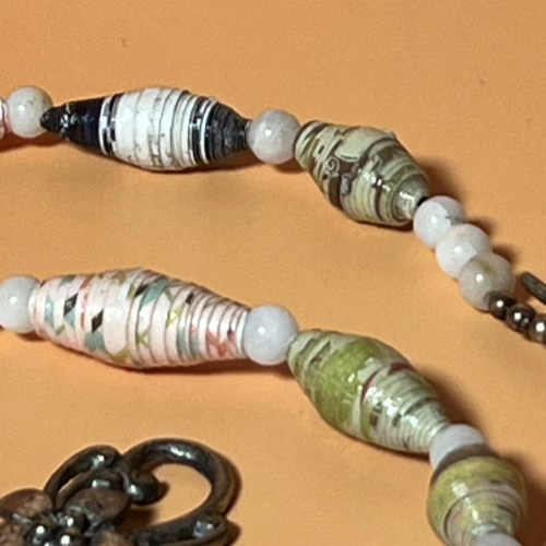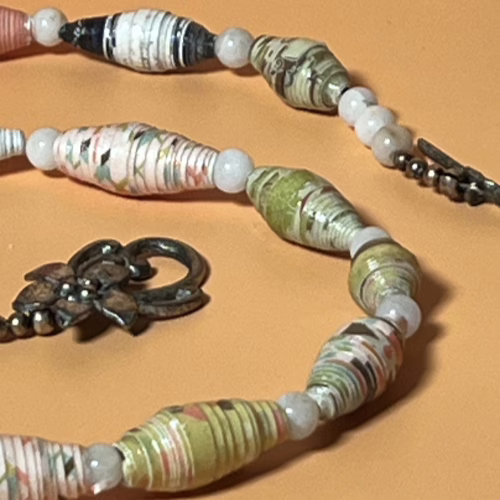 | Materials | hand rolled scrapbook paper beads, white and brass round spacer beads and an antique silver clasp set |