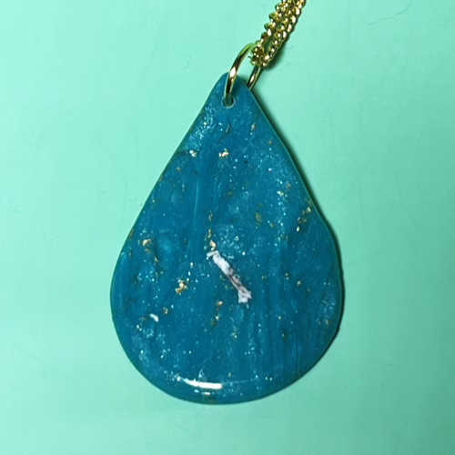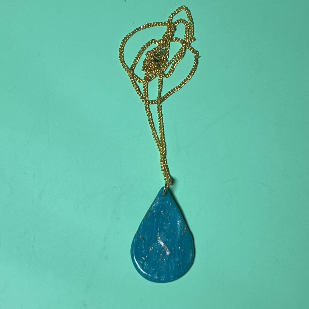 These Teal Teardrop Pendant Necklaces are composed of Polymer Clay, Gold Foil, and gold-plated necklace components including 24” Gold-plated chain with Lobster Clasp