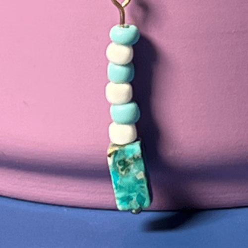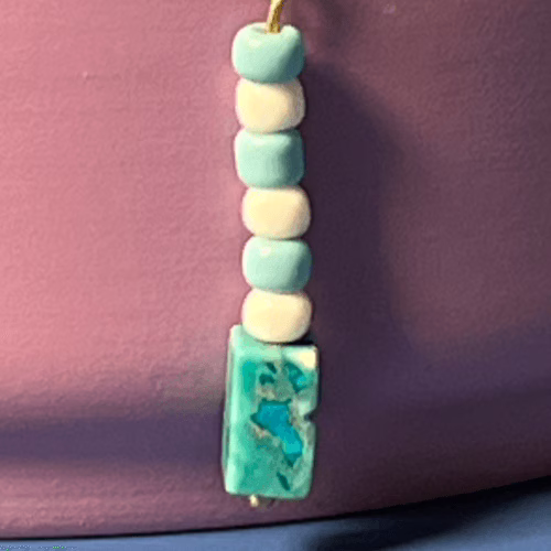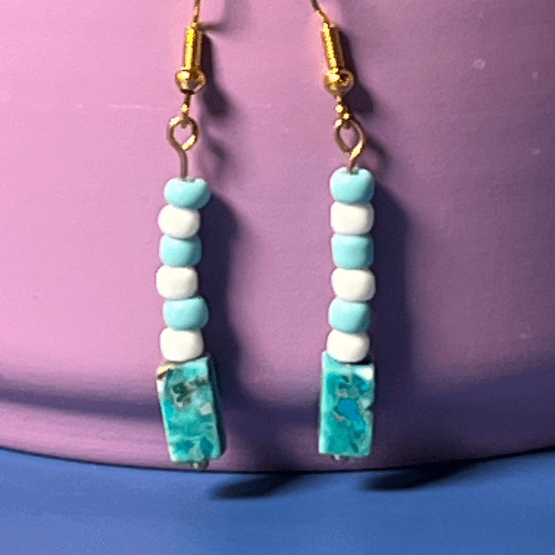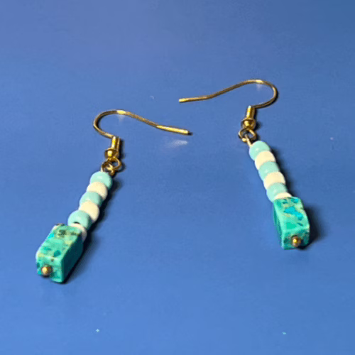 | Materials | Turquoise Blue Stone Block Beads, turquoise and white seed beads, gold plated earring components |